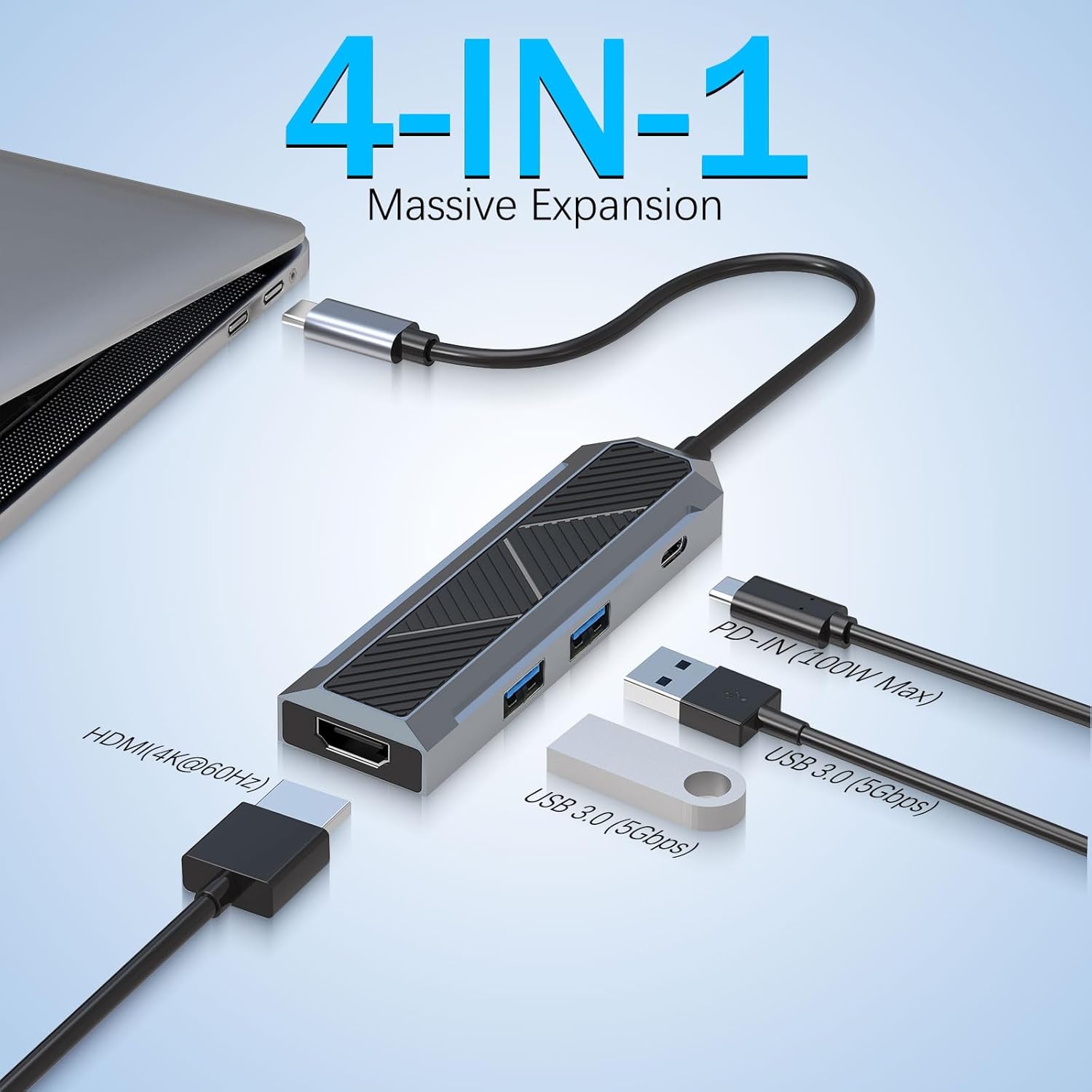 Hub USB-C 4 trong 1 với Bộ chia HDMI 4K 60Hz là thiết bị mở rộng đa chức năng kết nối với máy tính xách tay, máy tính bảng hoặc thiết bị tương thích thông qua giao diện USB-C. Nó chuyển đổi một cổng USB-C thành bốn tùy chọn kết nối thiết yếu, thường bao gồm đầu ra màn hình HDMI và nhiều cổng dữ liệu USB.