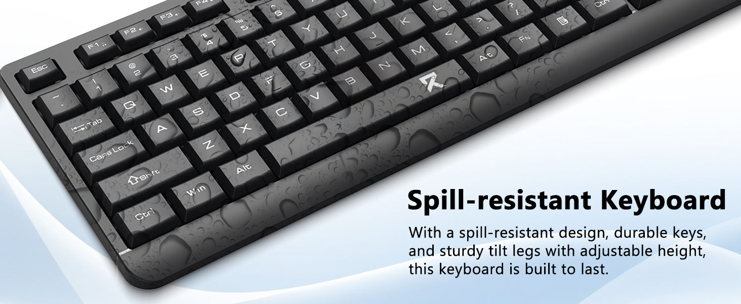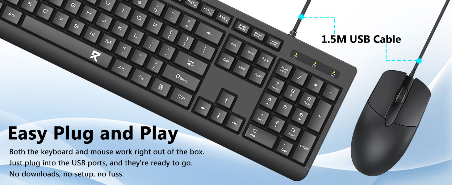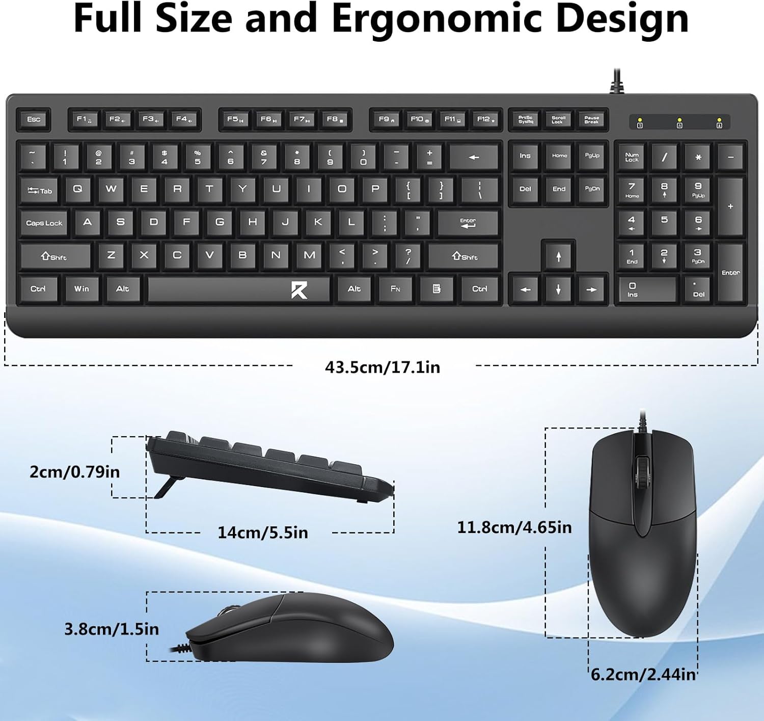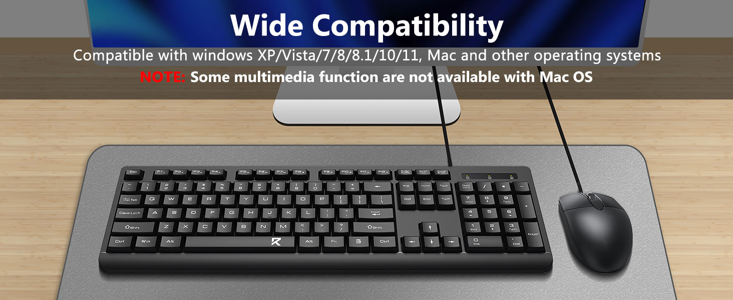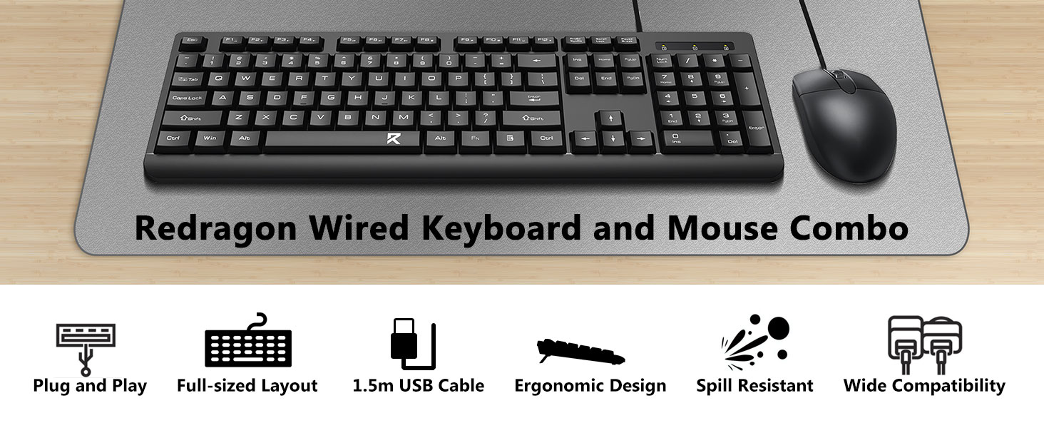 Bố cục bàn phím kích thước đầy đủ bao gồm bàn phím số, phím đa phương tiện và khoảng cách thoải mái giữa các phím. Chuột đi kèm được thiết kế để theo dõi chính xác và di chuyển con trỏ mượt mà trên nhiều bề mặt khác nhau.