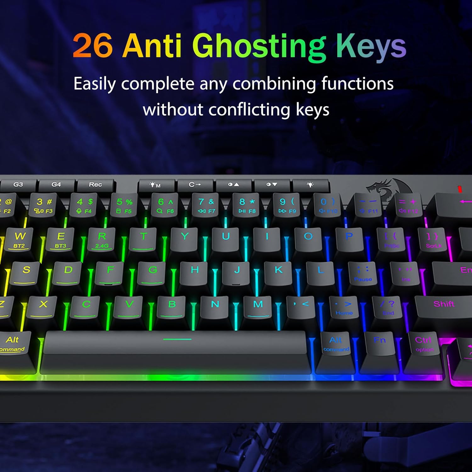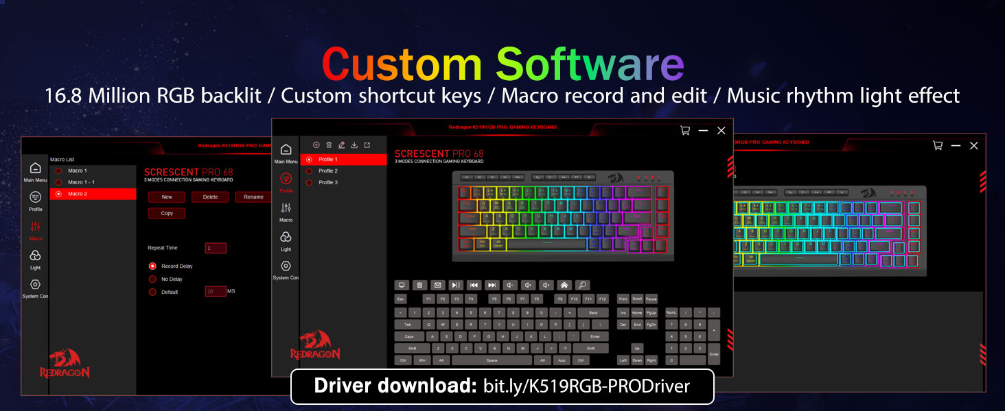 Bàn phím chơi game không dây di động Black K519 Pro của Redragon, do Chuangquan sản xuất, thể hiện kỹ thuật cấp chuyên nghiệp cho cả game thủ cũng như chuyên gia. Thiết kế ba chế độ linh hoạt của nó hỗ trợ kết nối Bluetooth ổn định, kết nối không dây 2,4 GHz có độ trễ thấp và kết nối có dây USB-C, cho phép chuyển đổi dễ dàng giữa ba thiết bị cùng lúc. Bàn phím bao gồm các phím macro chuyên dụng có thể được tùy chỉnh hoàn toàn thông qua phần mềm trực quan, cho phép người dùng gán các lệnh hoặc phím tắt phức tạp để nâng cao năng suất và hiệu quả chơi game. Hệ thống chiếu sáng RGB động với nhiều hiệu ứng giúp cá nhân hóa quá trình thiết lập, đồng thời N-key rollover và anti-ghosting đảm bảo mọi thao tác nhấn phím đều được ghi lại chính xác trong các phiên làm việc căng thẳng .