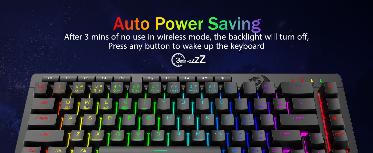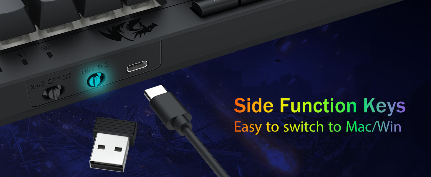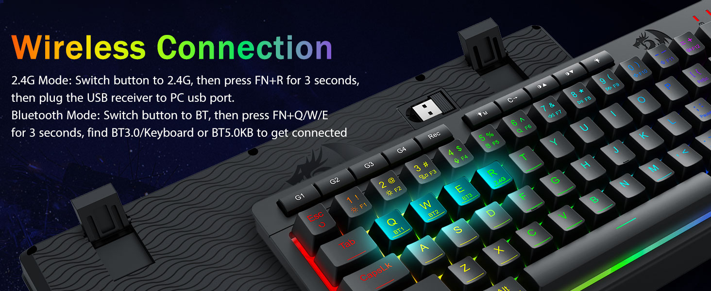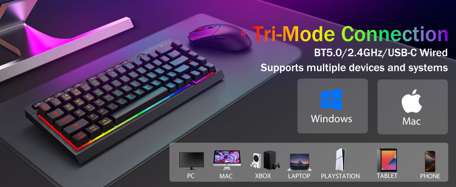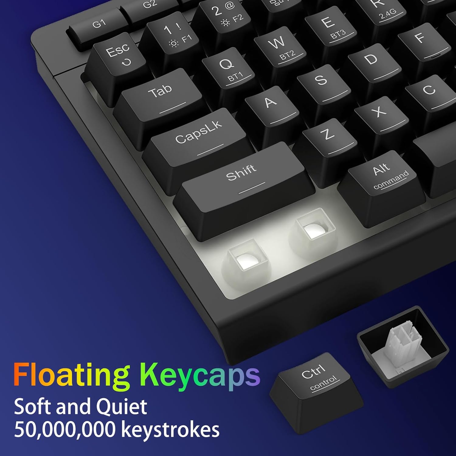 Tính linh hoạt của ba chế độ & Làm chủ nhiều thiết bị -Chuyển đổi liền mạch giữa các chế độ Bluetooth 5.0, không dây 2.4GHz hoặc có dây USB-C, kết nối đồng thời tối đa 5 thiết bị (PC, Mac, máy tính bảng, điện thoại, PS/XBOX). Chuyển đổi dễ dàng các thiết bị thông qua phím tắt hoặc nút bên cạnh—hoàn hảo cho các thiết lập chơi game/làm việc kết hợp. Duy trì năng lượng trong nhiều tuần với pin 4.000mAh (thời gian chờ hơn 30 ngày, thời gian chạy RGB 50 giờ).