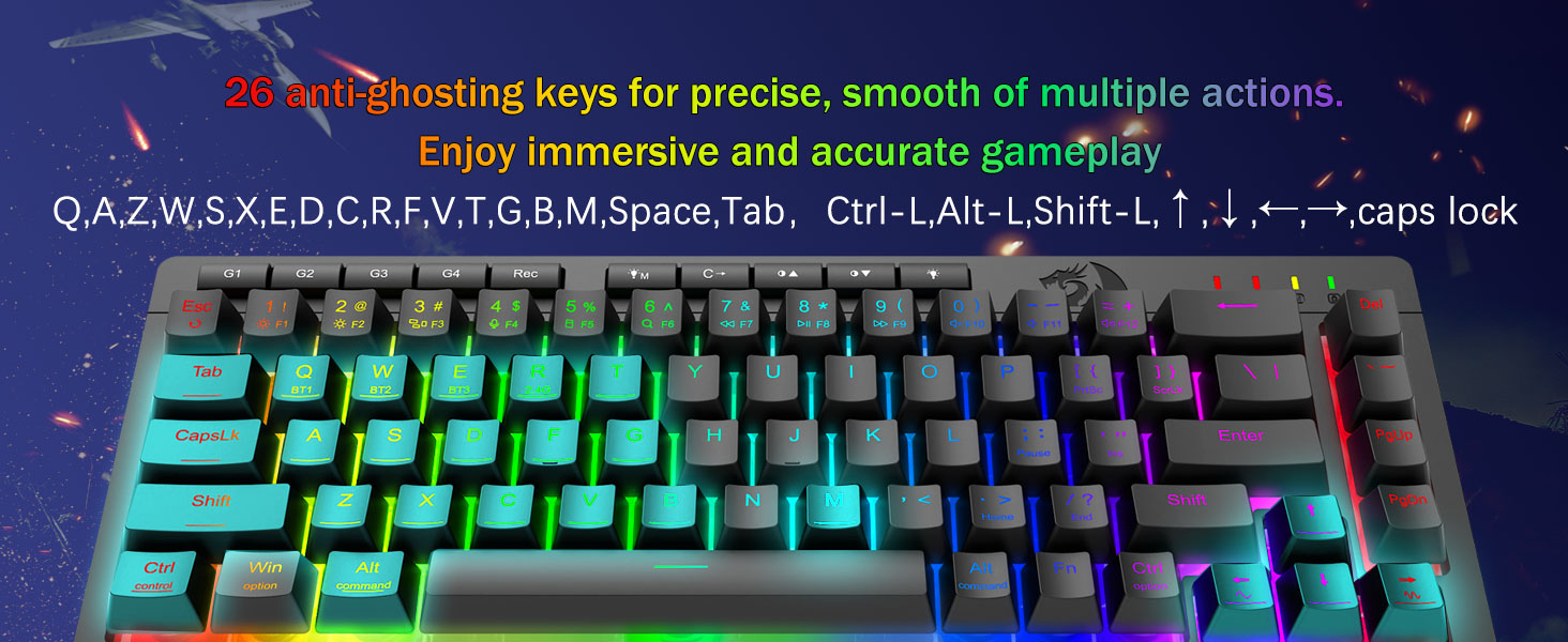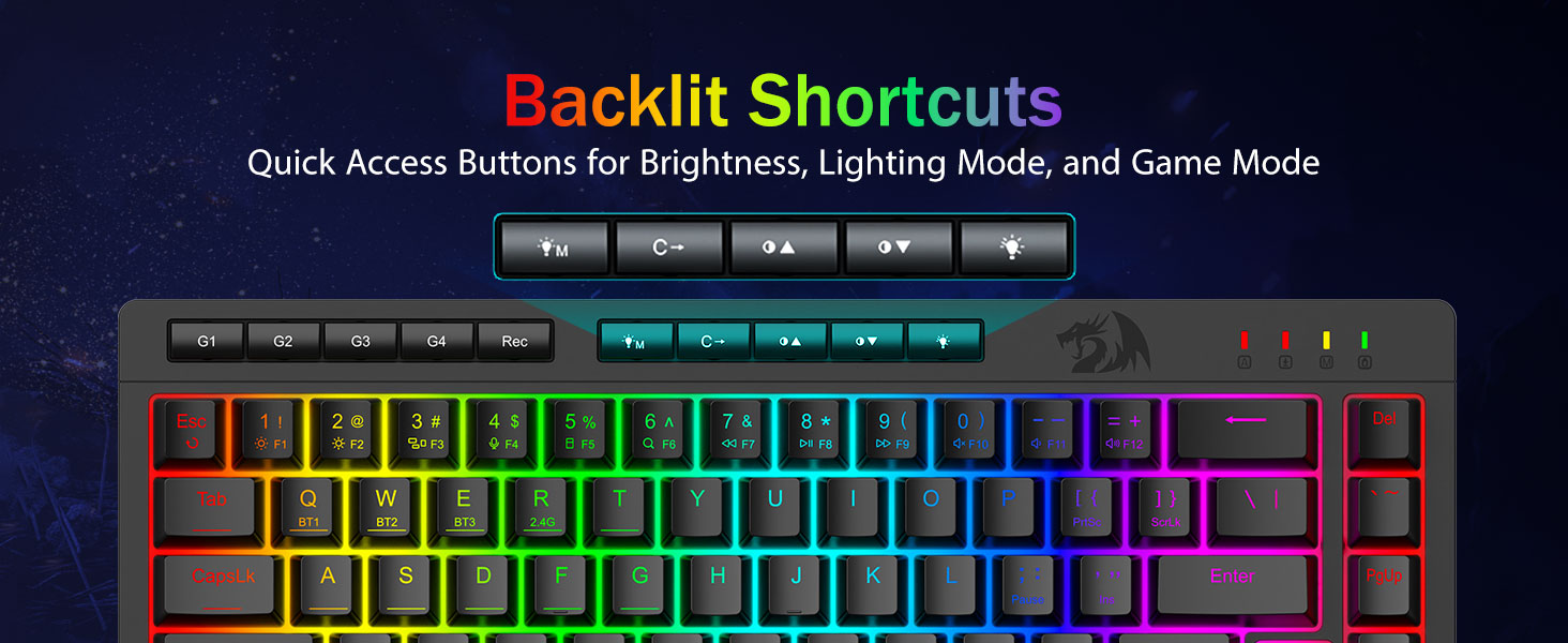 Hiệu suất chơi game đẳng cấp & Điều khiển có đèn nền chuyên dụng -Trang bị phím chống bóng ma (phím có dấu gạch dưới) cho phép 26 phím hoạt động đồng thời để phản hồi trò chơi nhanh và chính xác theo cách bạn mong muốn. Các nút truy cập nhanh về Độ sáng, Chế độ chiếu sáng và Chế độ trò chơi để nhanh chóng điều chỉnh độ sáng, cấu hình ánh sáng và bật chế độ trò chơi chỉ bằng một nút chạm.
