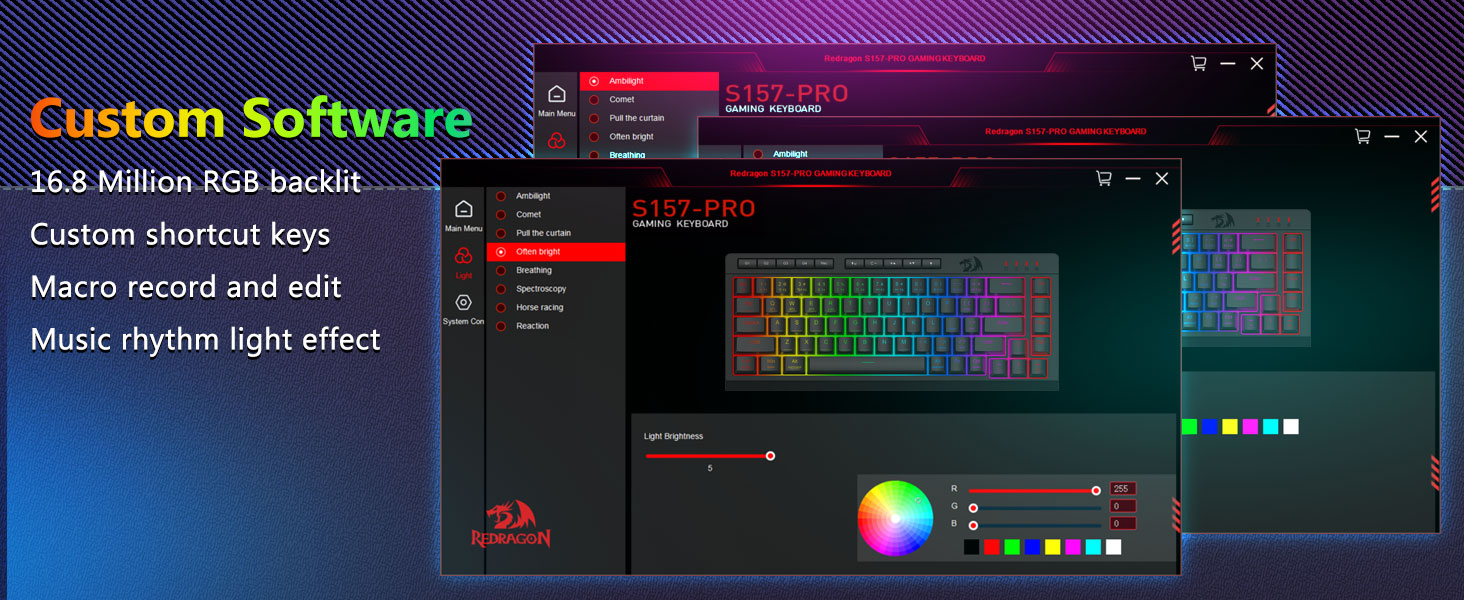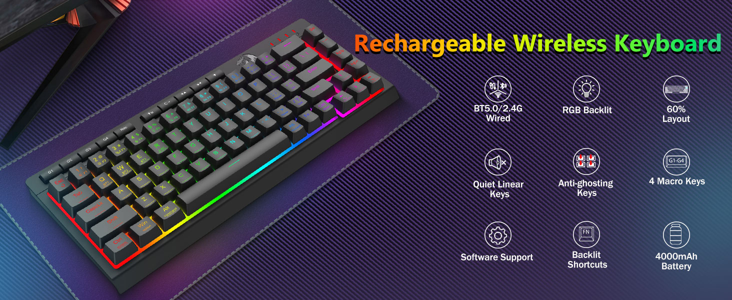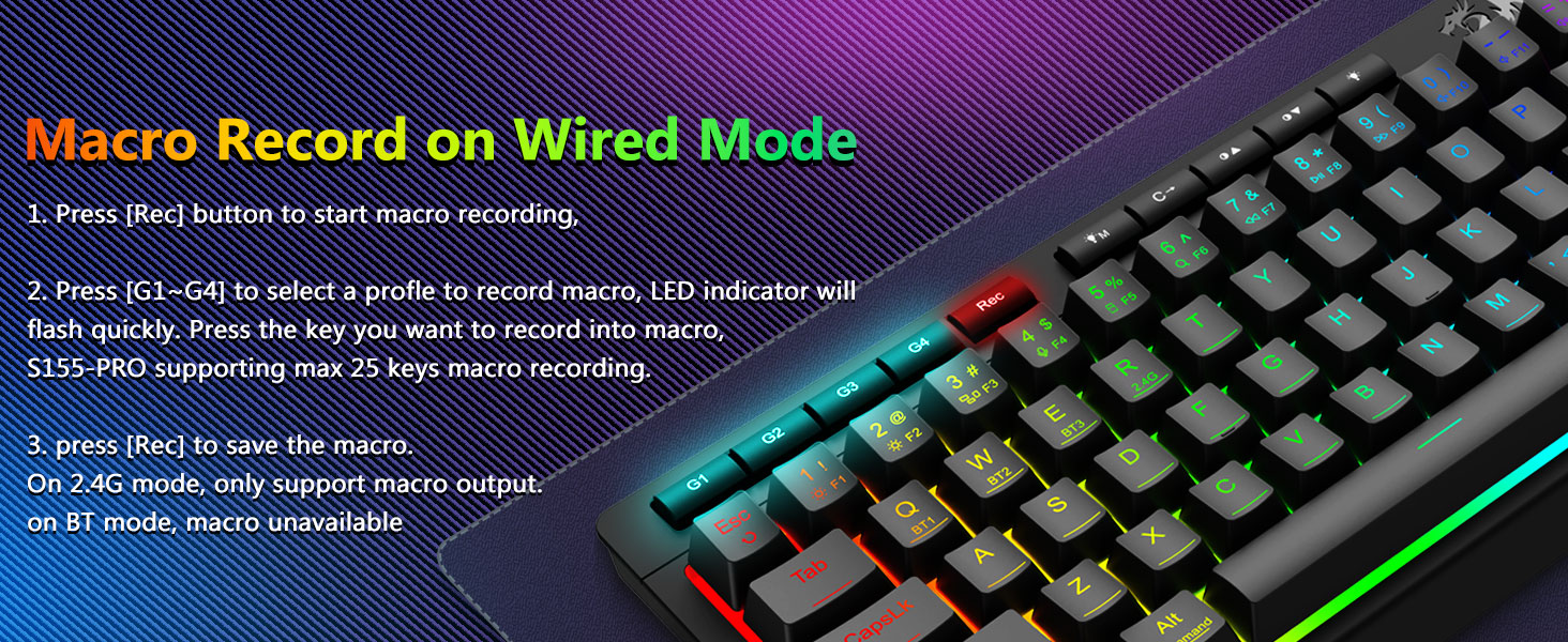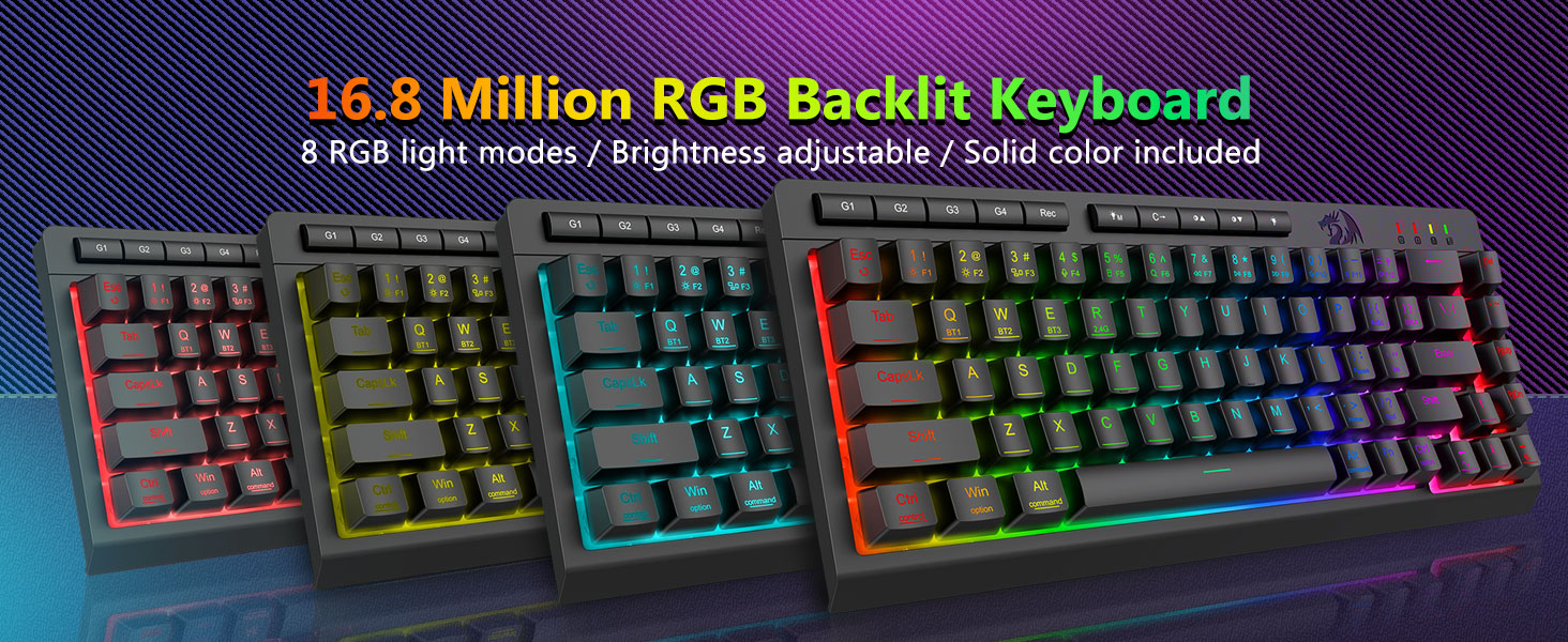 Macro có thể tùy chỉnh, Điều khiển ngược sáng chuyên dụng- Giải phóng 16,8 triệu màu RGB với 8 chế độ cài sẵn (Rainbow Wave, Reactive Typing) + 6 cấu hình DIY. Điều chỉnh độ sáng từ chế độ rực rỡ sang chế độ ẩn—lý tưởng để chơi game vào đêm khuya hoặc sử dụng văn phòng.