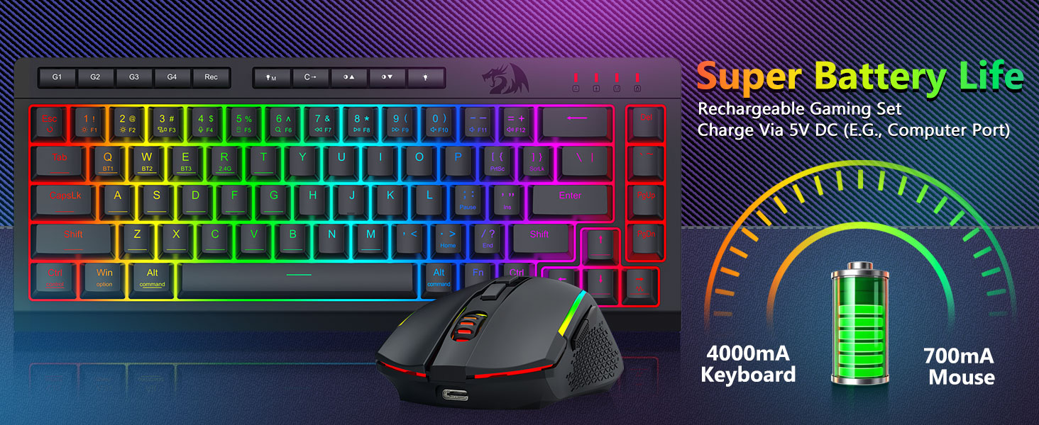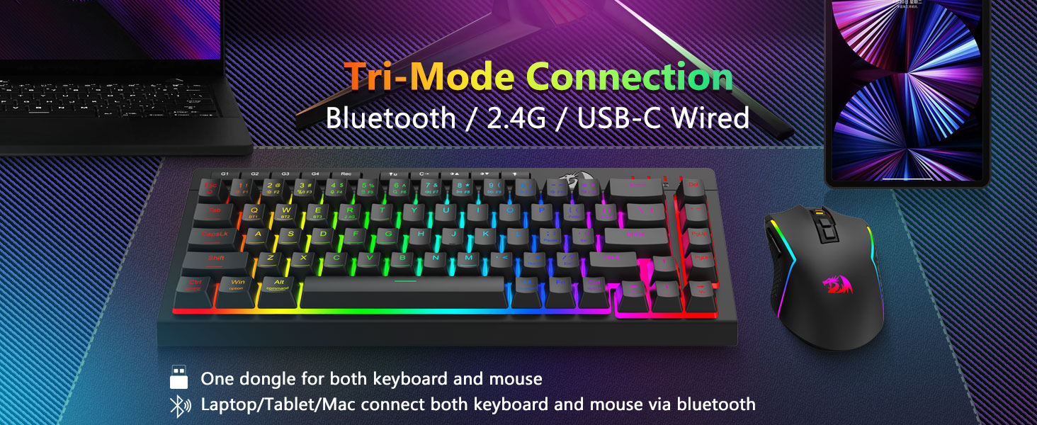 Bàn phím và chuột đa năng ba chế độ- Chuyển đổi liền mạch giữa các chế độ Bluetooth 5.0, không dây 2.4GHz hoặc có dây USB-C, kết nối với các thiết bị khác nhau (PC, Mac, máy tính bảng, điện thoại, PS/XBOX). Chuyển đổi dễ dàng các thiết bị thông qua phím tắt hoặc nút bên cạnh—hoàn hảo cho các thiết lập chơi game/làm việc kết hợp. Duy trì năng lượng trong nhiều tuần với bàn phím pin 4.000mAh và Chuột pin 700mAh (thời gian chờ hơn 30 ngày, thời gian chạy RGB 50 giờ).