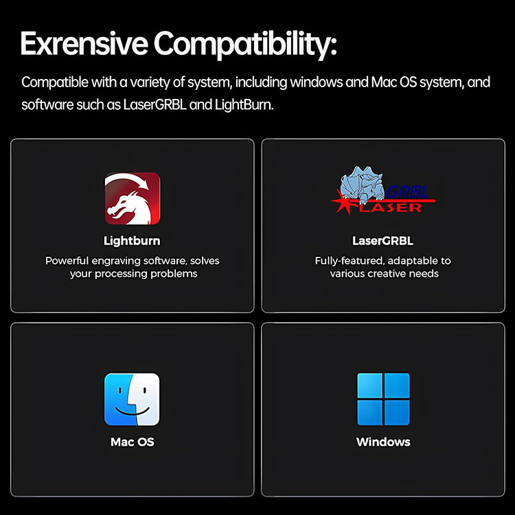 · ❤️ Khả năng tương thích mở rộng:Tương thích với nhiều hệ thống khác nhau, bao gồm cả hệ điều hành Windows và Mac OS cũng như các phần mềm như GRBL và LightBurn.