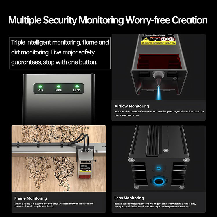 · ❤️ Thiết kế khép kín với khả năng cắt siêu mạnh:Máy khắc Creality Falcon2 Pro 22W với cảm biến kép, hiển thị trạng thái niêm phong, tạm dừng đóng nắp, cảnh báo đèn cảnh báo đảm bảo sáng tạo an toàn hơn, có thể cắt ván gỗ trầm 10mm chỉ trong một lần. Với tính năng Hỗ trợ khí tích hợp, có thể điều chỉnh luồng khí tự động hoặc thủ công để tạo ra các dự án hoàn hảo.