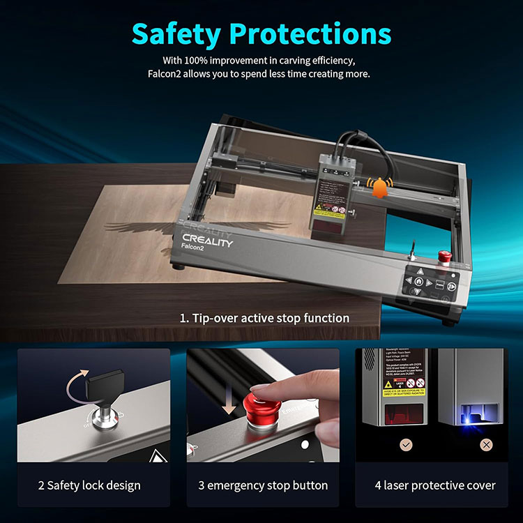 · Năm biện pháp bảo vệ an toàn:Công tắc giới hạn hai chiều. Nếu đầu laser chạm vào ranh giới, nó sẽ dừng tự động và còi. Chức năng dừng tích cực. Khắc laser sẽ ngừng hoạt động trong trường hợp nghiêng, lật hoặc thả bằng tiếng chuông và chỉ báo gửi cảnh báo. Thiết kế khóa bảo mật. Nó chỉ có thể sử dụng chuyên nghiệp. Nút dừng khẩn cấp. Một bước để dừng lại. Laser bảo vệ nắp. Được làm bằng vật liệu thủy tinh lọc màu sẽ ngăn tia laser rực rỡ mắt.