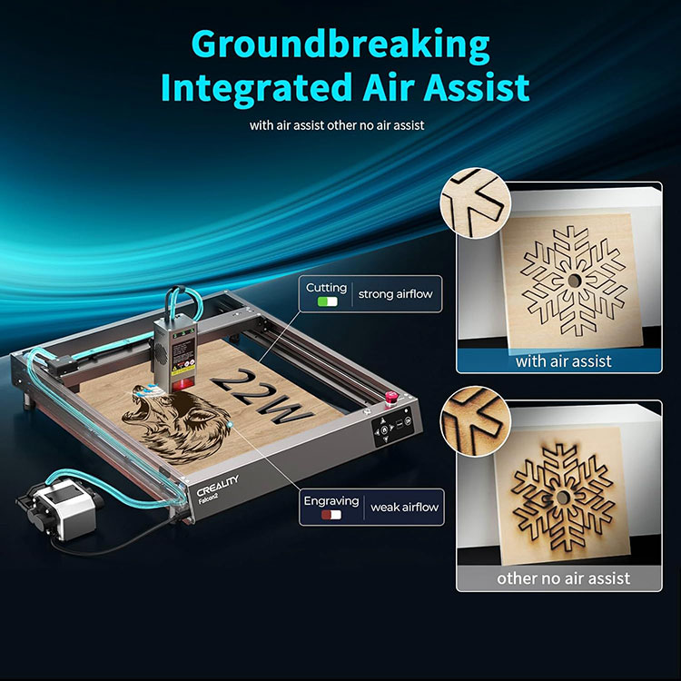 · Hỗ trợ không khí tích hợp đột phá:Điều chỉnh thủ công hỗ trợ không khí bước qua núm hoặc nó có thể tự động điều chỉnh luồng không khí qua Lightburn, để loại bỏ khói và bảo vệ ống kính laser, mang lại kết quả sạch hơn.