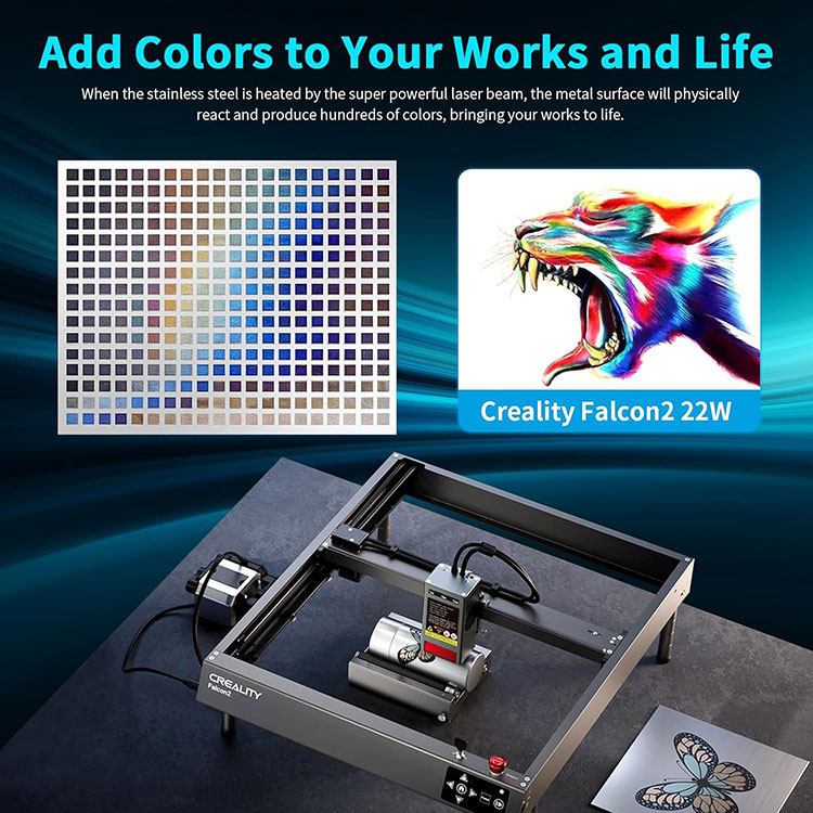 · Cuộc sống đầy màu sắc đầy màu sắc:Khi thép không gỉ được làm nóng bởi chùm tia laser siêu mạnh từ máy khắc laser creality, bề mặt kim loại sẽ phản ứng vật lý và tạo ra hàng trăm màu sắc, đưa các tác phẩm của bạn trở nên sống động. Xuất hiện sự sáng tạo của bạn với Creality Falcon2.