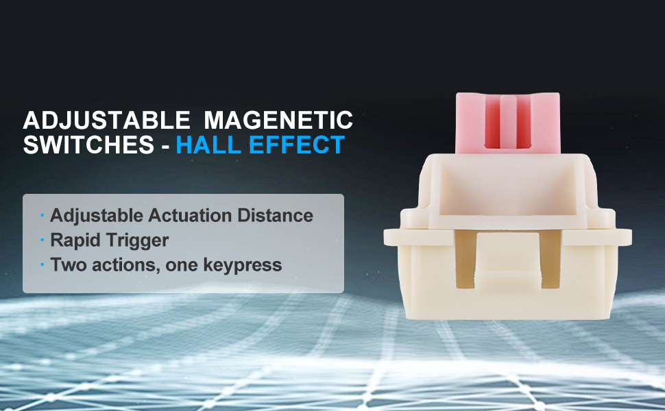 Công tắc từ sử dụng cảm biến hiệu ứng Hall để phát hiện chuyển động của phím, cung cấp các điểm kích hoạt có thể điều chỉnh và nhận dạng đầu vào nhất quán. Không giống như các switch cơ học truyền thống, công nghệ này giúp giảm hao mòn vật lý và đảm bảo độ ổn định lâu dài.