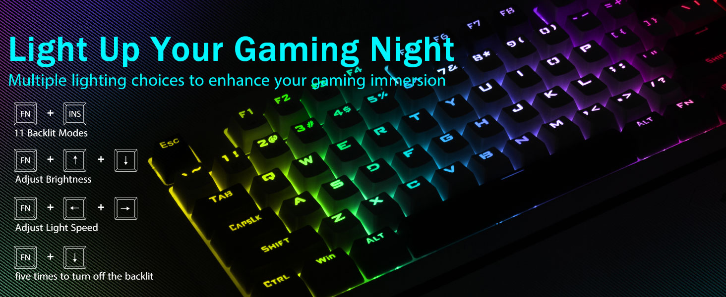 【Bàn phím có đèn nền cầu vồng cho trải nghiệm đắm chìm】Chiếu sáng màn hình của bạn với 11 chế độ đèn nền động, 5 mức tốc độ và độ sáng có thể điều chỉnh. Bàn phím này là công cụ thay đổi cuộc chơi trong quá trình thiết lập trò chơi của bạn, nâng cao tâm trạng và sự đắm chìm của bạn, đặc biệt là trong môi trường ánh sáng yếu. Mũ phím ABS phun kép siêu bền đảm bảo đèn nền đồng nhất, rõ ràng, cải thiện độ chính xác khi gõ của bạn ngay cả trong bóng tối.