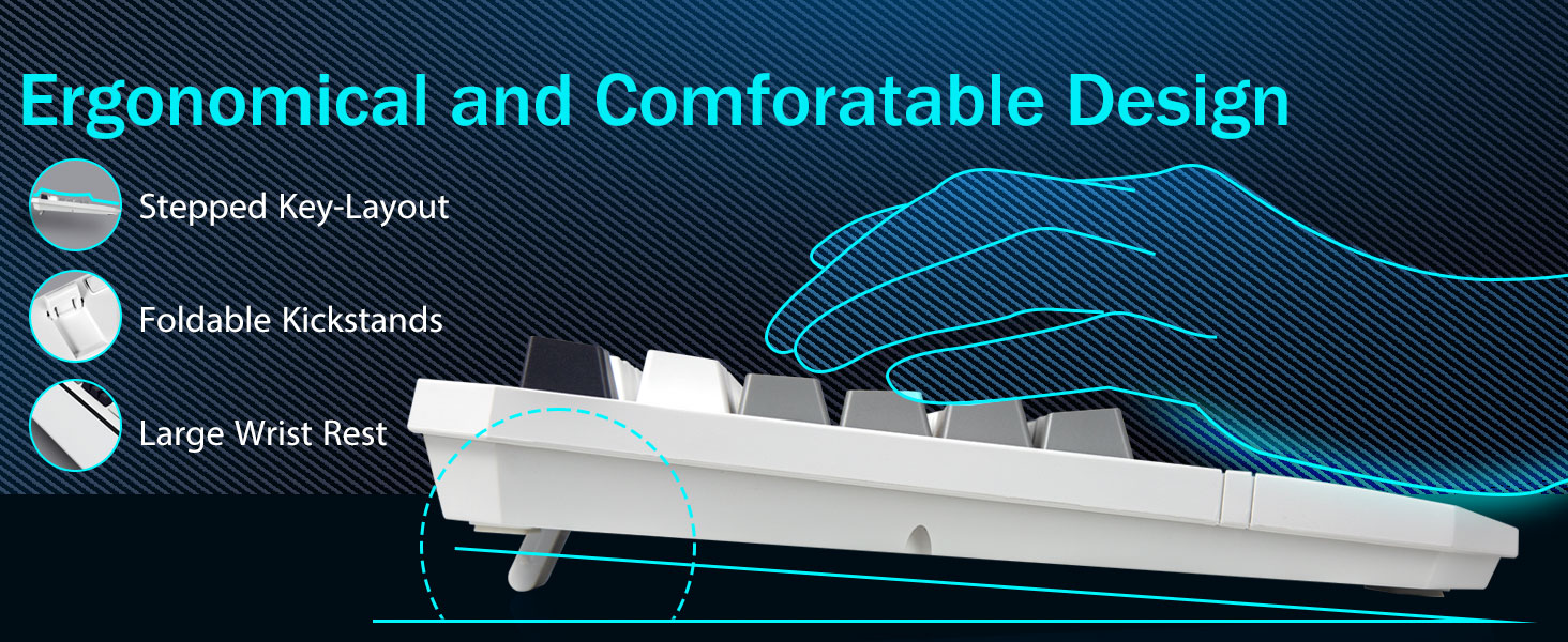 【Công thái học nâng cao mang lại sự thoải mái cả ngày】Được thiết kế hướng đến sự thoải mái của bạn, bàn phím dành cho game thủ PC của chúng tôi có bố cục keycap bậc thang khoa học và chỗ tựa tay rộng rãi. Thiết lập này giữ cho cánh tay của bạn ở vị trí tự nhiên, giảm mỏi tay khi sử dụng kéo dài. Bàn phím có dây còn đi kèm 2 chân đế phía sau chắc chắn, có thể gập lại, cho phép bạn điều chỉnh độ dốc để có tư thế tối ưu.