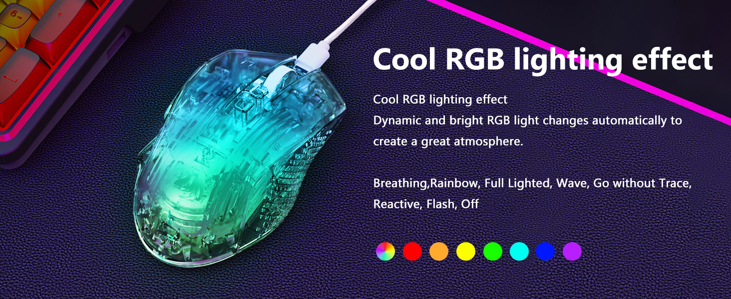 Chuột bao gồm tám hiệu ứng ánh sáng RGB giúp nâng cao sức hấp dẫn thị giác mà không ảnh hưởng đến hiệu suất. Người dùng có thể chuyển đổi giữa các chế độ chiếu sáng để phù hợp với thiết lập hoặc sở thích cá nhân của mình.